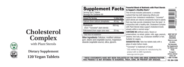 Cholesterol Complex with Plant Sterols is a high potency blend of some of the most popular cholesterol support products available today. We have combined policosanol, a complex nutrient that has both balancing effects and supports liver cholesterol metabolism, with natural plant sterols, components found in plants that may help excrete cholesterol from the body. Small amounts of plant sterols are found in fruits and vegetables. Concentrated forms, as in dietary supplements, offer a greater benefit in supporting healthy cholesterol levels by binding to cholesterol and excreting it from the body. Policosanol, a derivative of sugar cane wax, works in similar fashion to rid cholesterol.